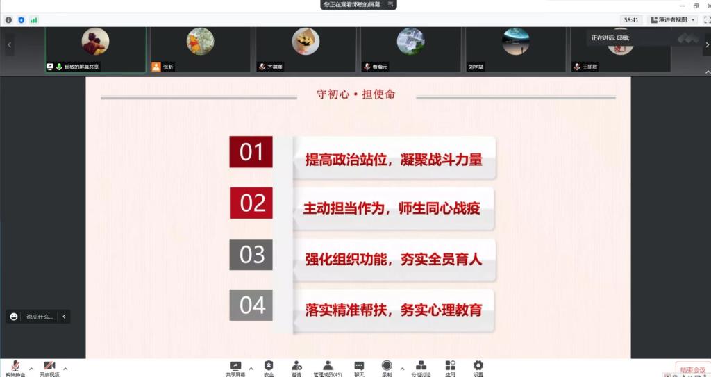 邱敏以“守初心 担使命——在战疫中彰显党性”为报告题目,从提高政治站位,凝聚战斗力量;主动担当作为,师生同心战”疫”;强化组织功能,夯实全员育人;落实精准帮扶,务实心理教育四个方面用生动的事例、接地气的语言,为全体党员上了生动一课。