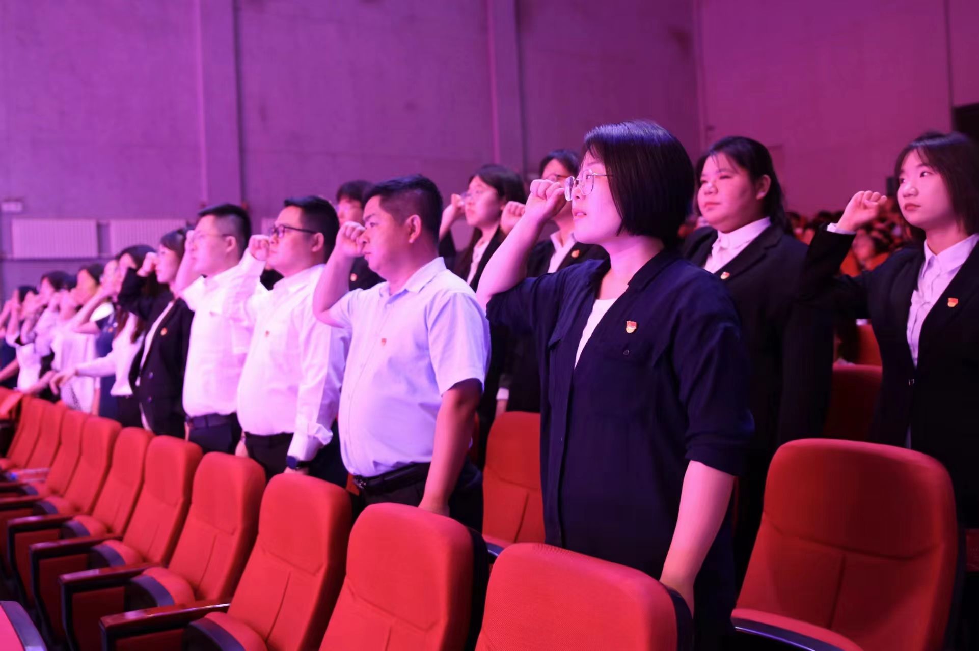 全体党员宣誓,一起面向党旗,右手握拳,站姿挺拔,庄严宣誓,向党组织许下庄严承诺。
