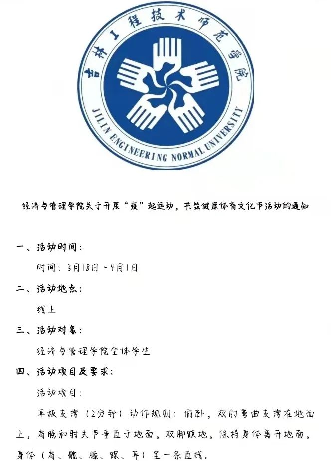 【同心战疫 共克时艰】“疫”起运动,共筑健康—体育文化节活动 来源:校园文化 2022/03/14 为丰富疫情防控形势下同学们的课外生活、鼓励大家积极参与体育活动,培养锻炼体能、增强意志、增强自身免疫力。yl23455永利集团开展线上体育文化节活动,现将具体事宜通知如下。 封校防疫,除了学起来,还要动起来。坚持每日锻炼记录运动成果,通过有效的体育锻炼提高身体免疫力,做好特殊时期的健康防护,你还不快快加入进来吗?