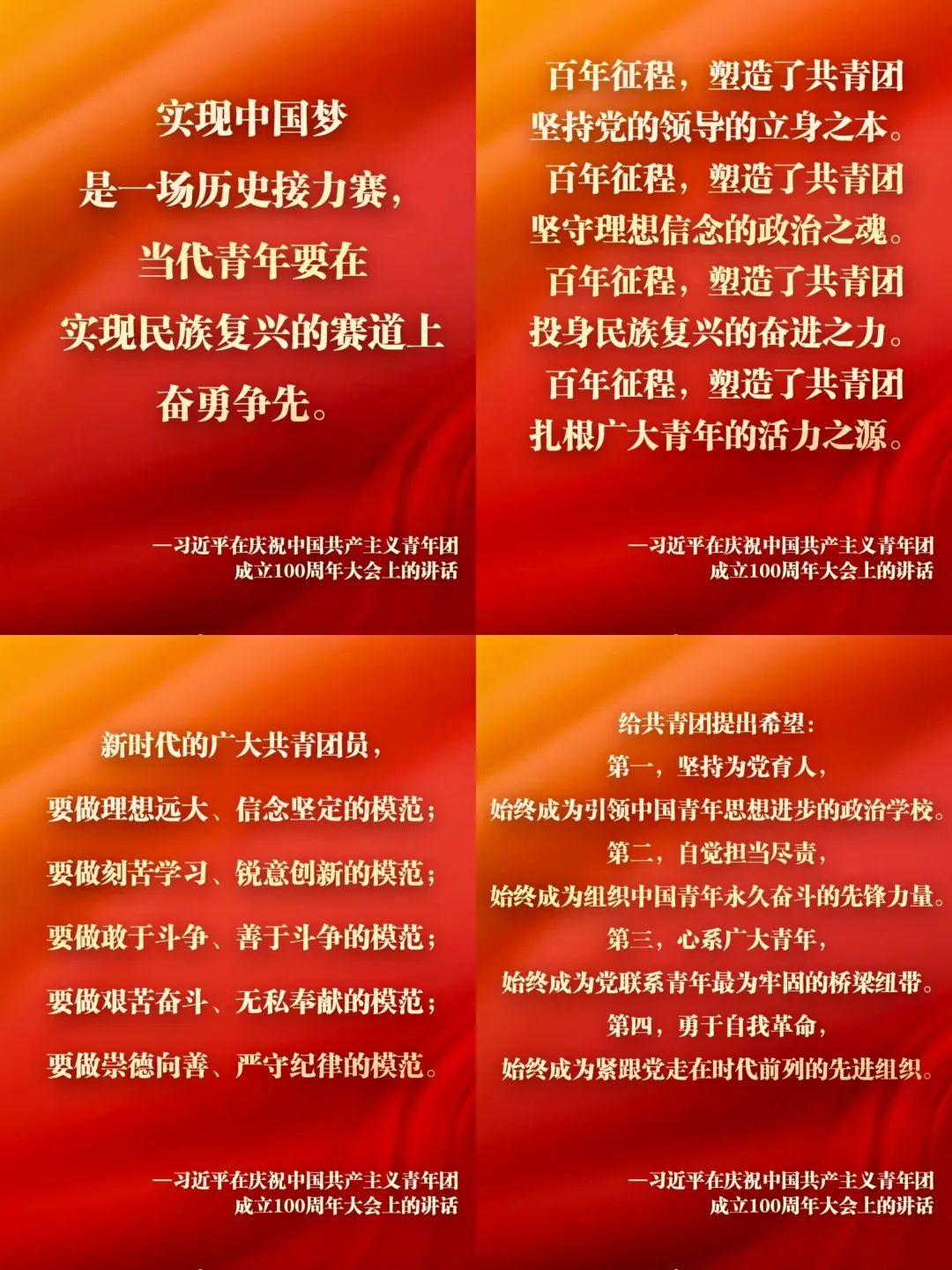 今天,我们在这里隆重集会,庆祝中国共产主义青年团成立100周年,就是要激励广大团员青年在实现中华民族伟大复兴中国梦的新征程上奋勇前进。