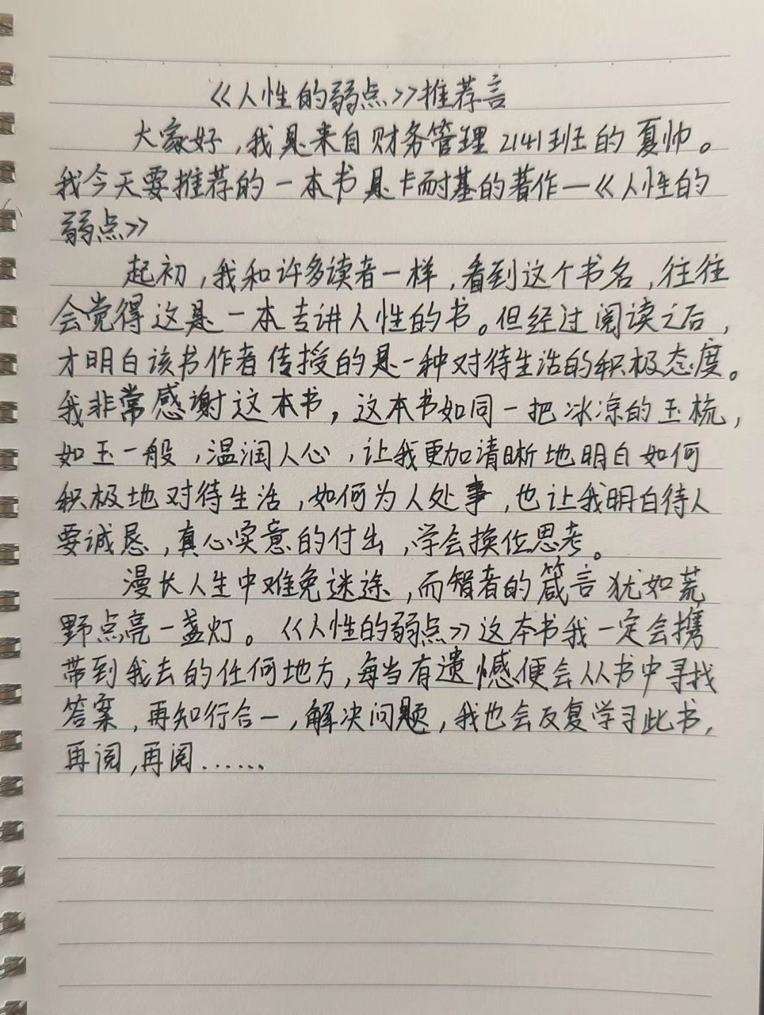读后感:大家好,我是来自财管2141班的同学夏帅。我今天要推荐的一本书是卡耐基著作——《人性的弱点》。