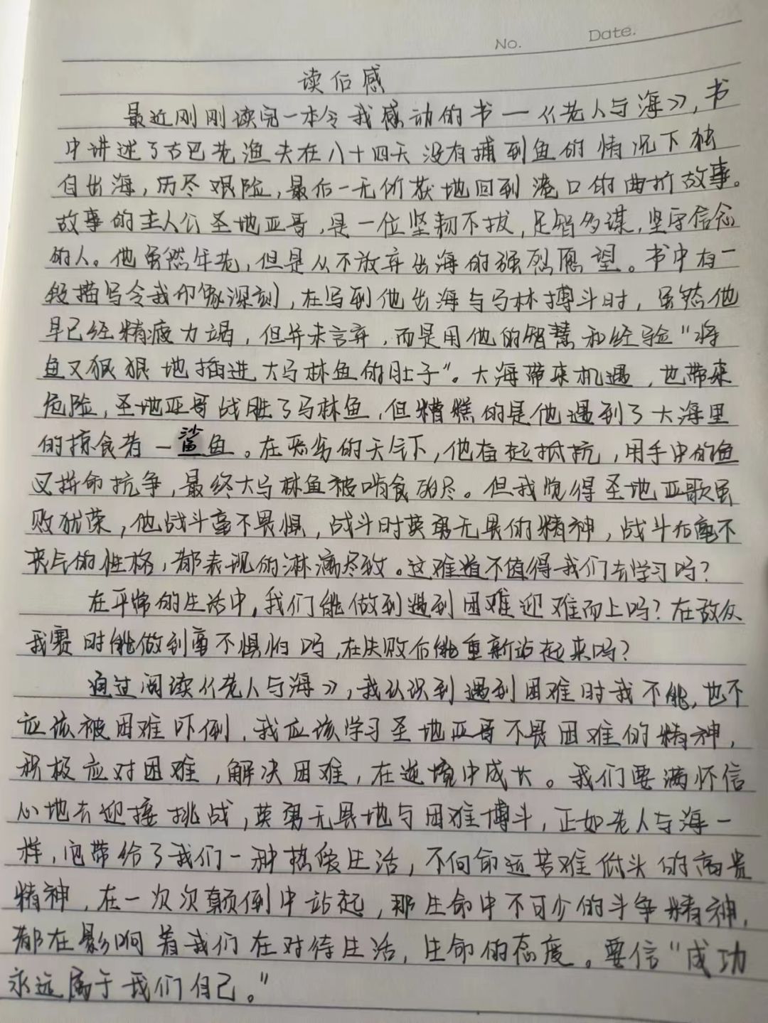 通过阅读《老人与海》,我认识到遇到困难时我不能,也不应该被困难吓倒,我应该学习圣地亚哥不畏困难的精神,积极应对困难,解决困难,在逆境中成长。我们要满怀信心地去迎接挑战,英勇无畏地与困难搏斗,要坚信成功永远属于我们自己。