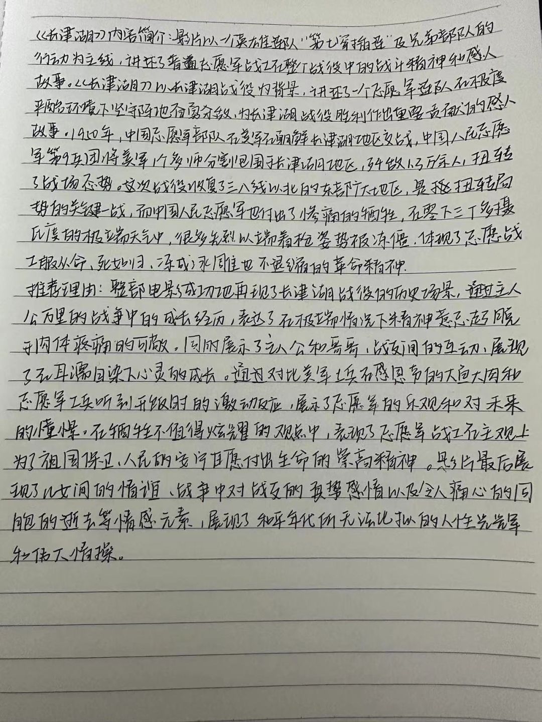 观后感:影片以一个英雄连队“第七穿插连”及兄弟部队的行动为主线,讲述普通志愿军战士在整个战役中的战斗精神和感人故事。整部电影成功地再现了长津湖战役的历史场景,通过主人公万里在战争中的成长经历,表达了在极端情况下精神意志超脱于肉体疼痛的可敬。在牺牲不值得炫耀的观点中,表现出了志愿军战士在主观上为了祖国的保卫、人民的安宁甘愿付出生命的崇高精神。