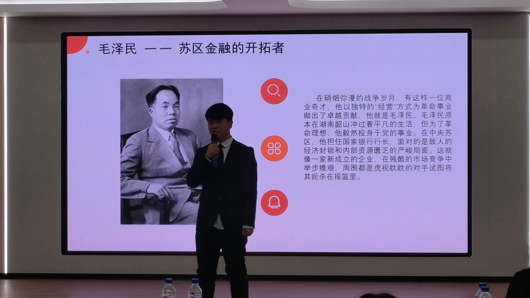 市场营销2441班曹瑞在演讲中称毛主席为苏区金融的开拓者。并运用红色品牌案例进行研究,发掘出具有红色文化的品牌产品。