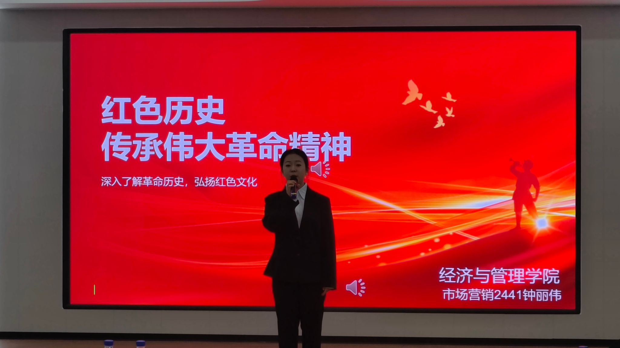 市场营销2441班钟丽伟讲述了红色历史,传承伟大革命精神,如井冈山的星星之火、长征的铁血征程,更是激发同学们的爱国情怀和奋斗精神。
