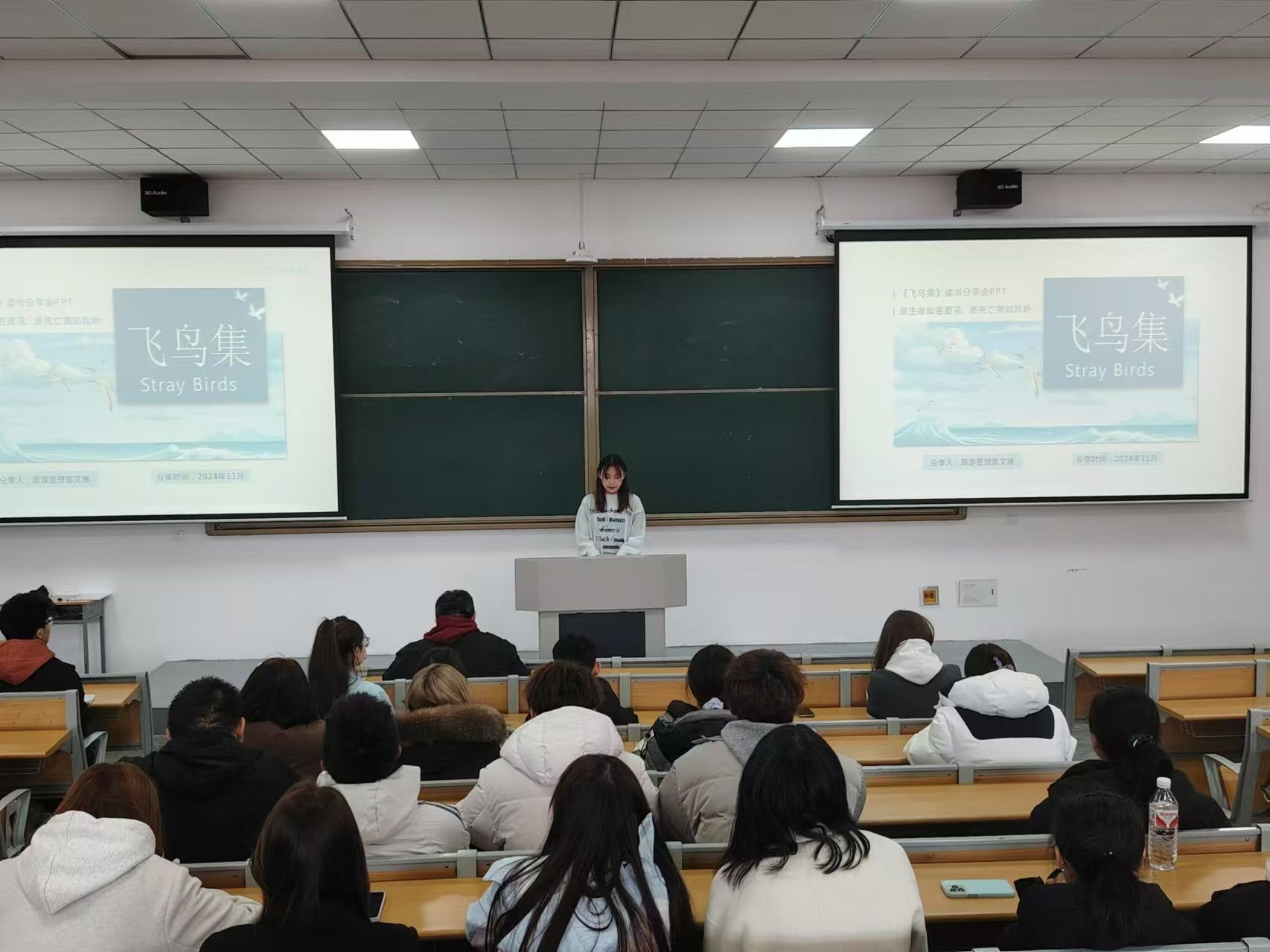 来自旅游管理2341班的姜文博同学向我们分享了经典名著泰戈尔的《飞鸟集》,为我们讲述“生如夏花之绚烂,死如秋叶之静美”这句诗绝美的意象,让我们思索生命的不同姿态与价值,鼓励人们在有限的时光里绽放最耀眼的光彩,而面对死亡时亦能坦然从容。也让我们感受到泰戈尔对自然万物细致入微的观察与热爱和对世间美好的感知与敬意。