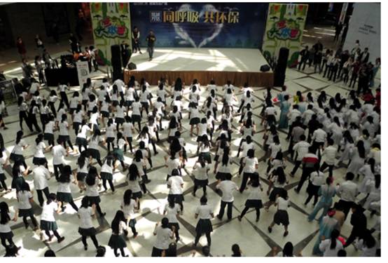 节目进行彩排。上午九点整,在热闹的开场舞之后活动正式开始。活动期间每个参与的学校都以他们自己的形式表现出:同呼吸,共环保