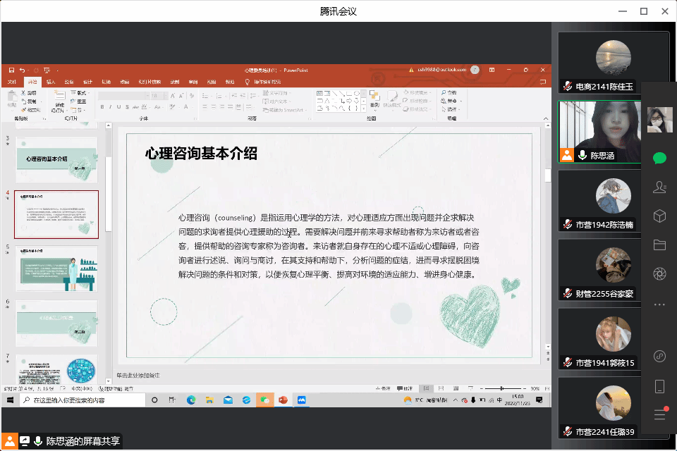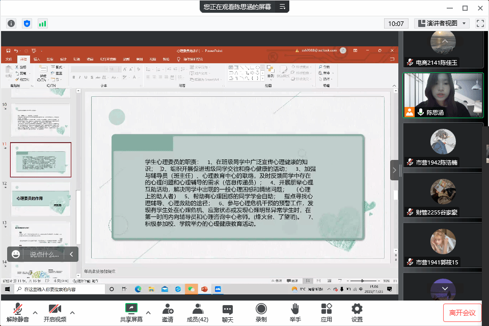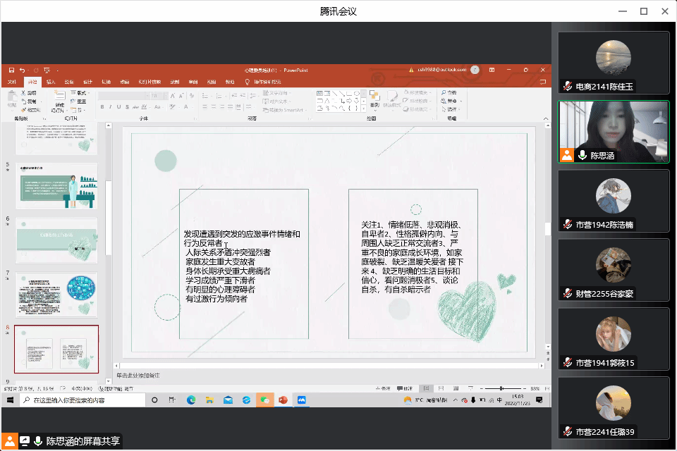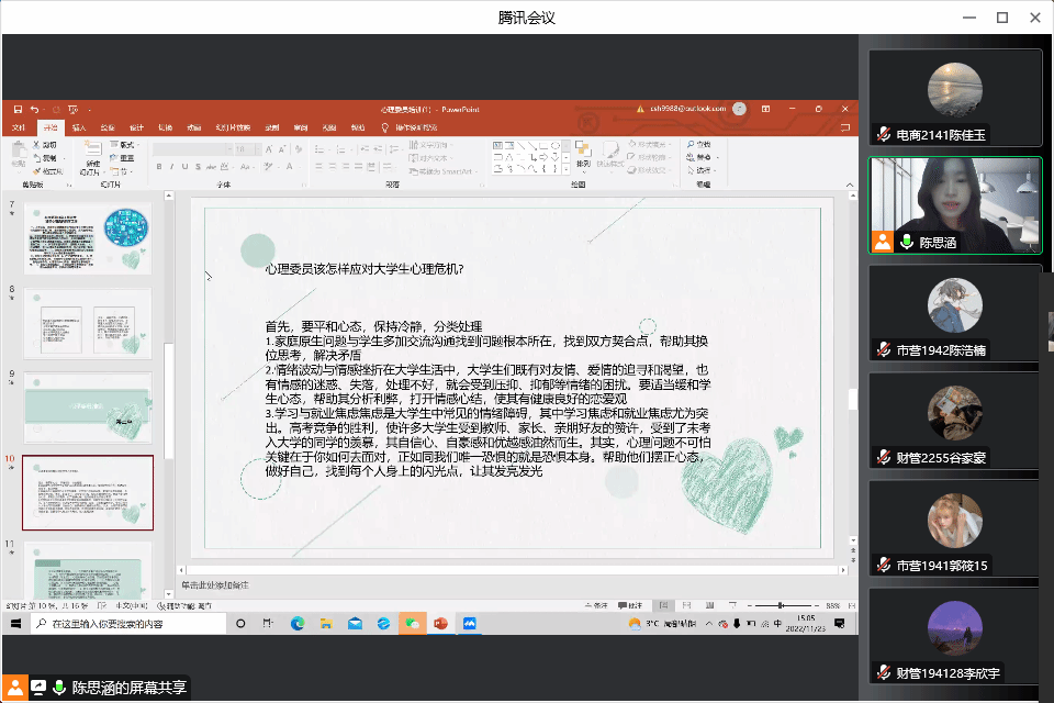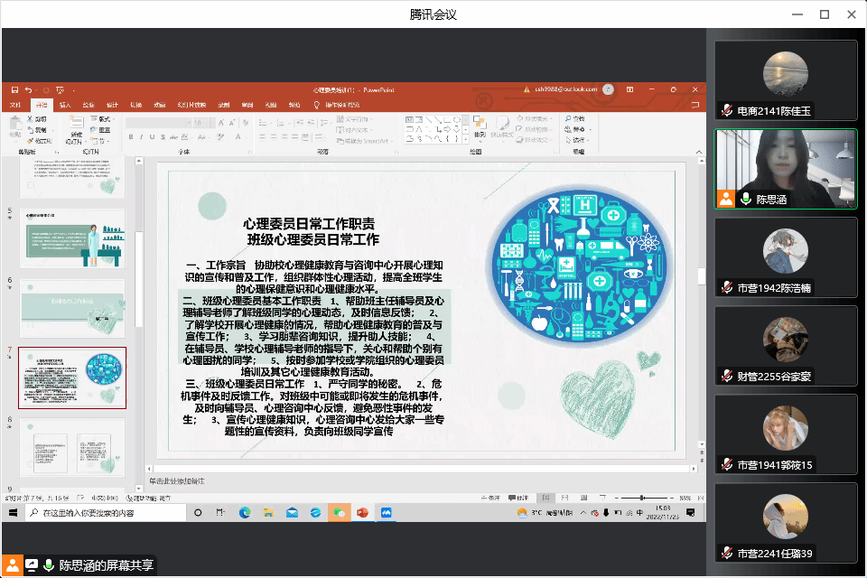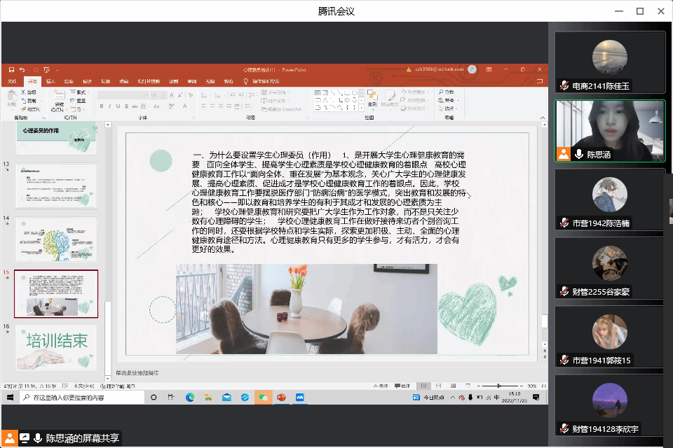 为加强我院学生心理工作队伍的建设,提高学生朋辈心理辅导的服务能力,逐步健全心理危机四级干预机制,保障学生的心理健康。11月23日15时,yl23455永利集团开展学生心理委员培训会。培训由管理工作部副部长陈思涵主讲,学院全体心理委员以线上会议方式参会。