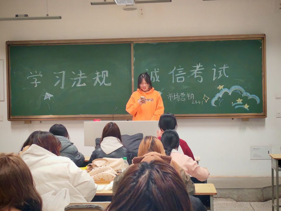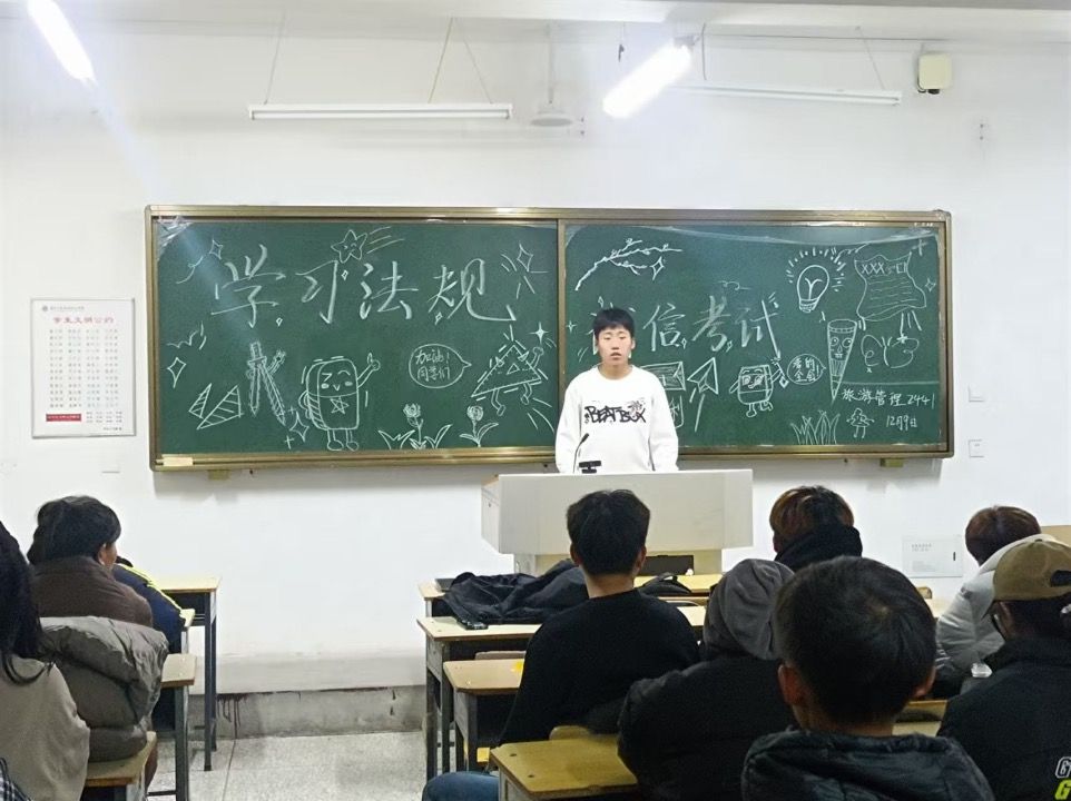 旅游管理2441班发言人以“学习法规,诚信考试”为主题进行交流,他呼吁每一位学生学习相关法规,以确保考试过程的公正性和诚信性。