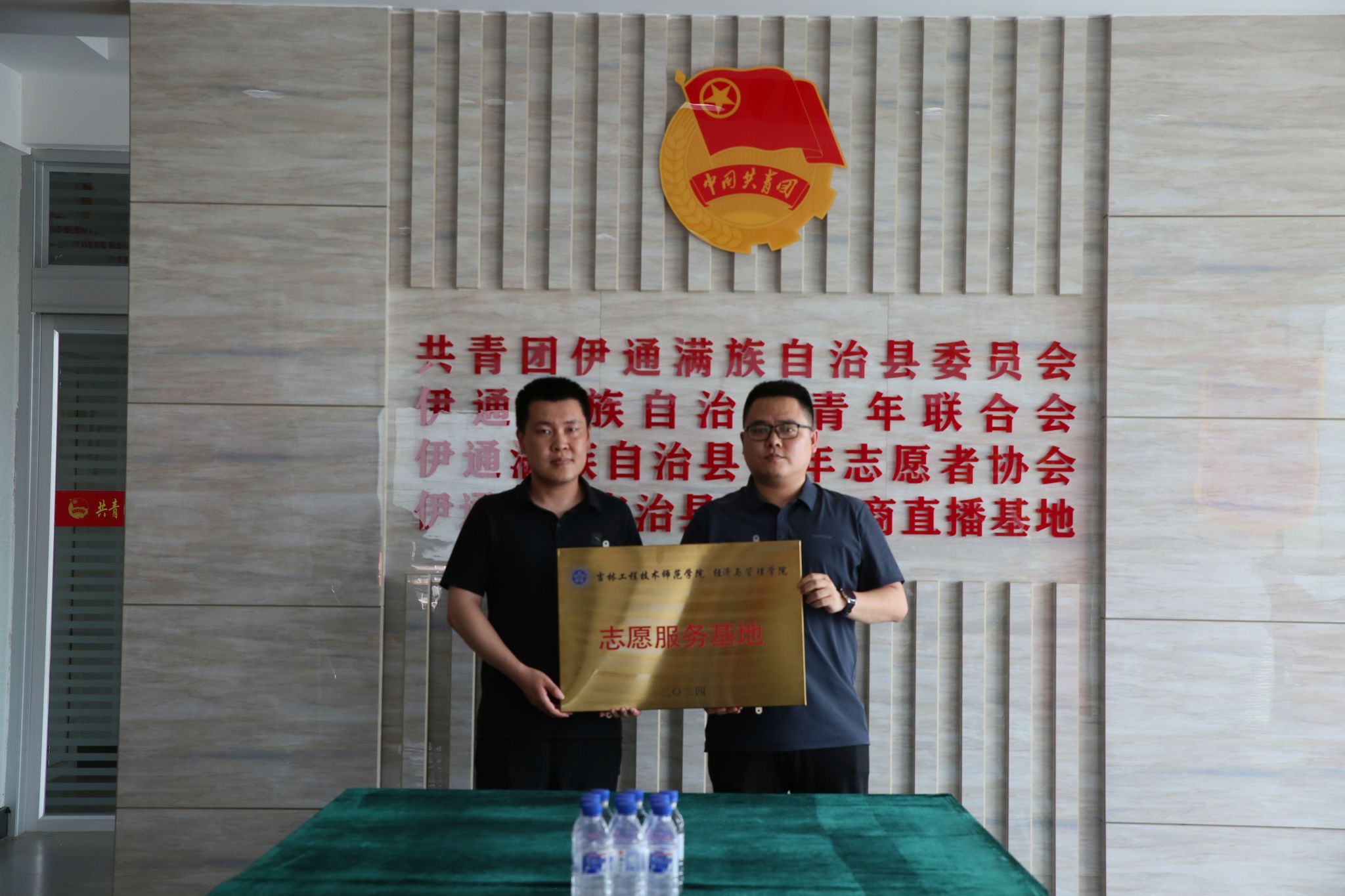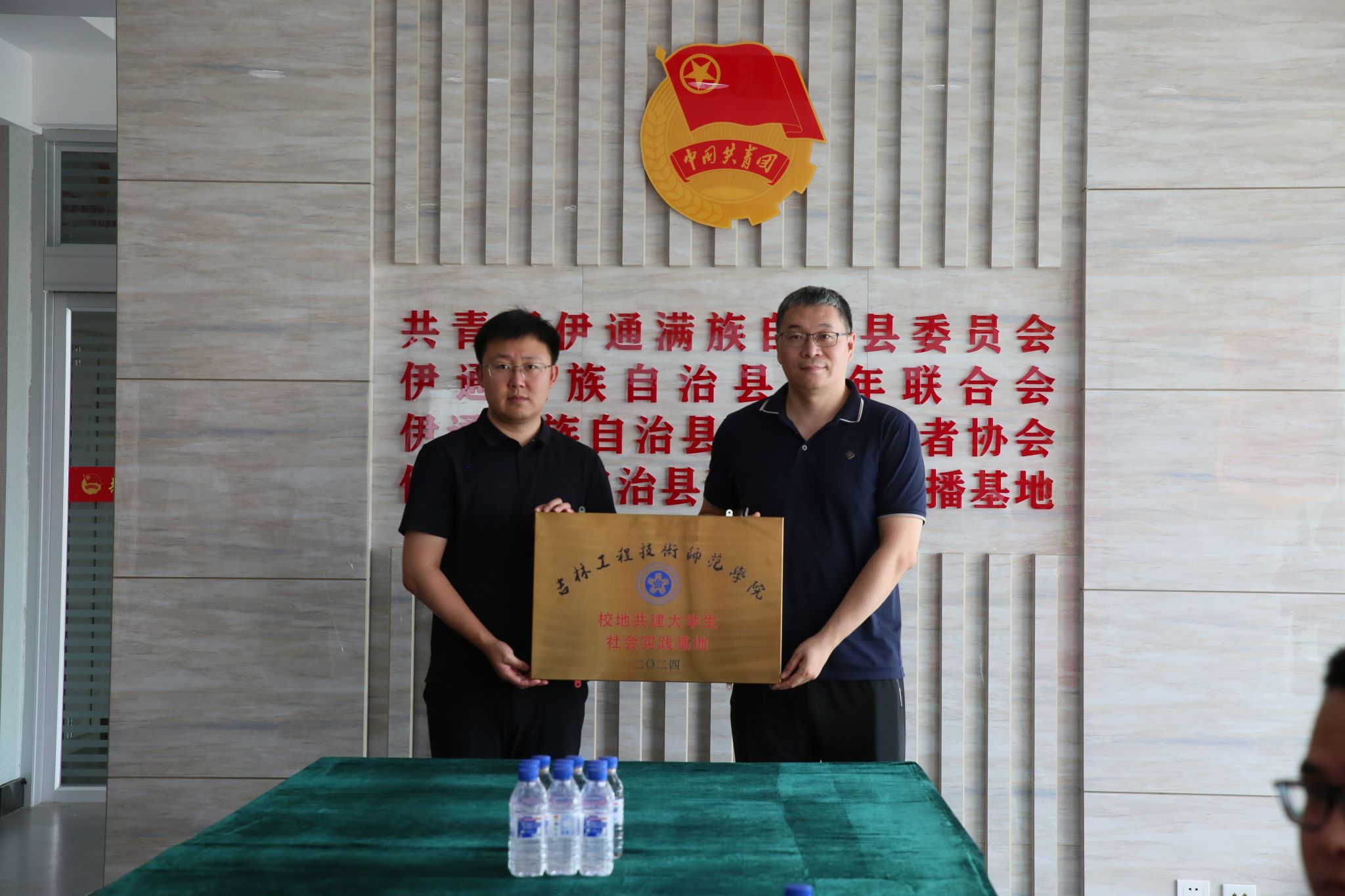 为加强校地合作,促进产学研融合发展,实践团队与伊通满族自治县领导在如何加强校地共建方面进行了深入的探讨和交流,院党委副书记陈昊宇和院团委书记王一名代表我院与伊通县团委进行社会实践教育基地揭牌仪式。