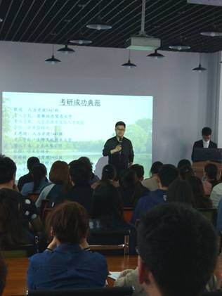 在提问环节结束后,睢忠林院长进行简短讲话。他分享了我校同学考研的成功案例,并和大家畅谈了个人心得体会。他强调,考研、公务员是对大家的挑战,也是同学们提升自我、超越自我的重要途径,希望大家能消除畏难情绪,勤奋、执著、坚定信念,只要奋战到底,必有收获;工商管理学院全体教师将永远站在同学们的背后,全心全意为同学服务、给予大家全力支持。