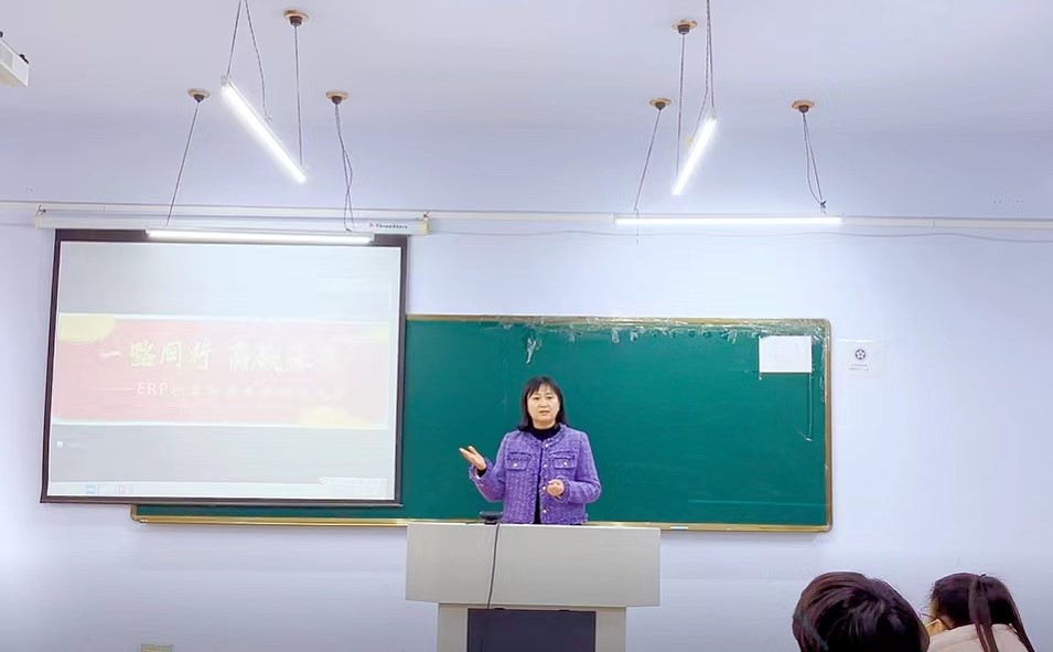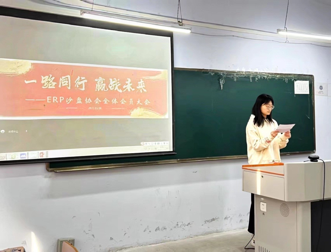 此次会议首先由秦彩萍老师发表致辞。会议中,秦彩萍老师为同学们讲述了ERP沙盘协会的宗旨,并表示:“沙盘协会是一个锻炼平台、大赛平台、试错平台、交流平台,和协作平台。希望各位同学们在ERP沙盘协会中能通过各项活动积攒经历,敢于试错,不断提高自身能力。在学校搭建的沙盘协会交流平台中,能够与老师和同学加强交流,在学习中收获成长。”此外,秦彩萍老师还宣布了近期沙盘的一系列工作任务。