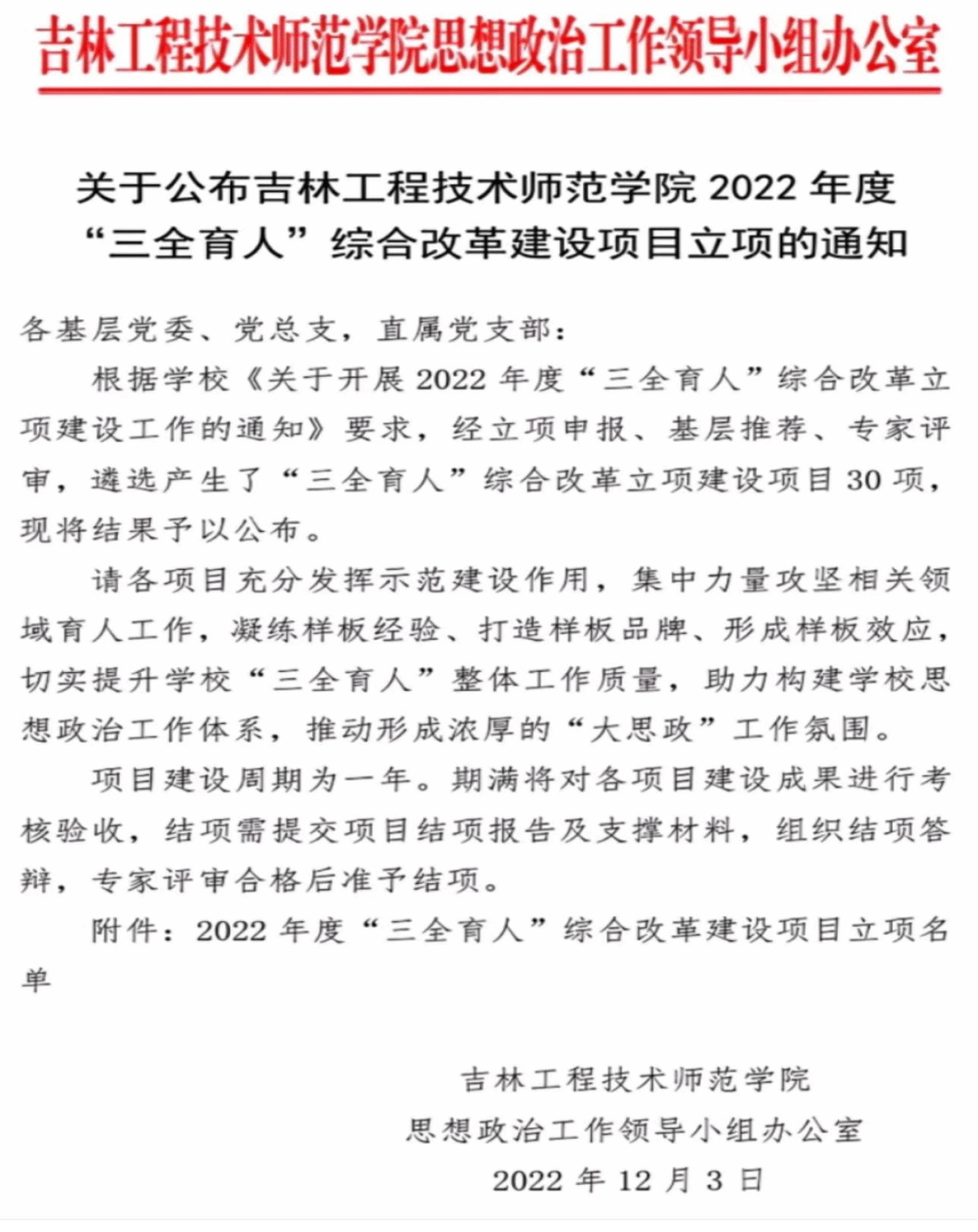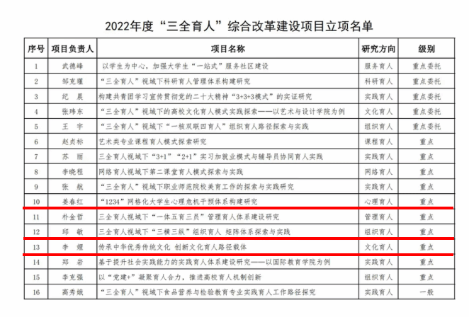 喜报:我院8个项目获2022年度校级“三全育人”综合改革立项建设 来源:学院新闻 2022/12/04 近日,学校2022年度“三全育人”综合改革立项建设项目立项评审结果揭晓,我院共获批8项,其中重点项目3项,一般项目5项。学院党委将以“三全育人”为契机,深入学习贯彻党的二十大精神,紧紧围绕立德树人根本任务,进一步强化组织领导、丰富育人内涵,不断深化“三全育人”综合改革,推动“三全育人”各项改革任务落地见效,形成全员全过程全方位的大思政工作格局。