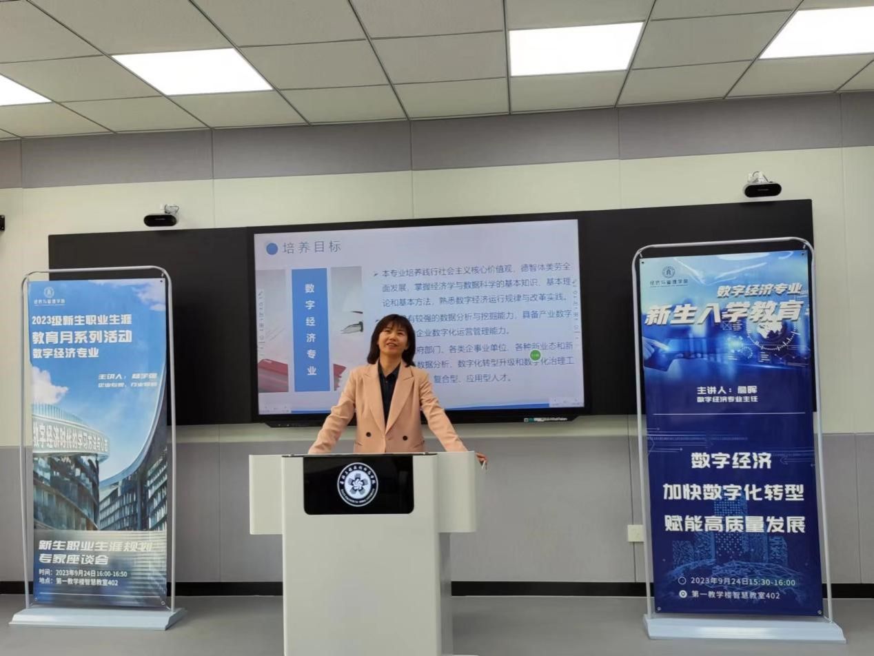 在接下来的新生入学专业教育会上,数字经济专业主任詹晖向新生介绍了数字经济专业的师资力量、专业概况、教学条件、培养计划和就业前景等基本情况。帮助新生对这个新开设不久的数字经济专业有了一定的感性认识和理解,明确了今后的专业培养目标和学习方向与信心,使新生树立起专业思想和专业归属感,能够以饱满的热情投入新的学习生活。并且,她希望新生能够在数字经济专业全体教师的共同努力下,快乐学习,健康成长。