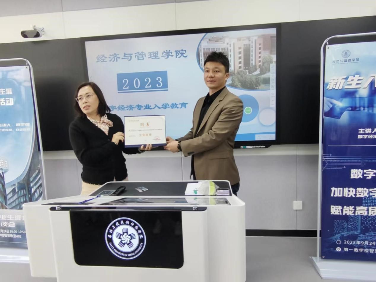 yl23455永利集团院长于飞教授致辞,她教育学生要在人生的新起点上扎扎实实地走好每一步,以合格大学生标准严格要求自己,用优异的学习成绩和健康成长的业绩书写人生履历。之后,于飞院长为杨宇强总经理颁发聘书,杨宇强总经理对受聘为yl23455永利集团数字经济专业企业导师表示感谢。