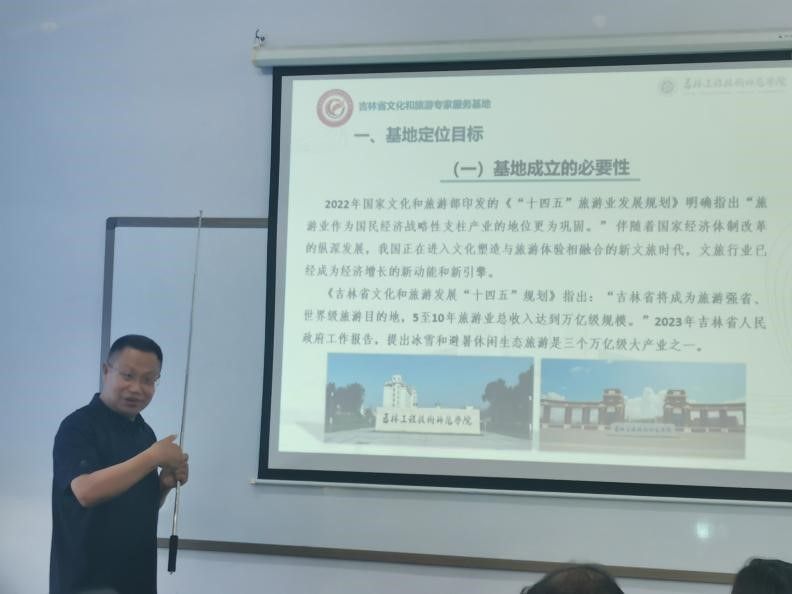 经济与管理学部部长、吉林省文化和旅游专家服务基地负责人刘贵富教授向考察调研组做专题汇报,根据《吉林省专家服务基地管理办法》中“基地的建立与管理”相关规定,刘贵富就基地定位目标、依托平台、专家队伍、建设思路、服务项目、服务成果、服务计划等7个方面逐一展开细致的汇报与解读。