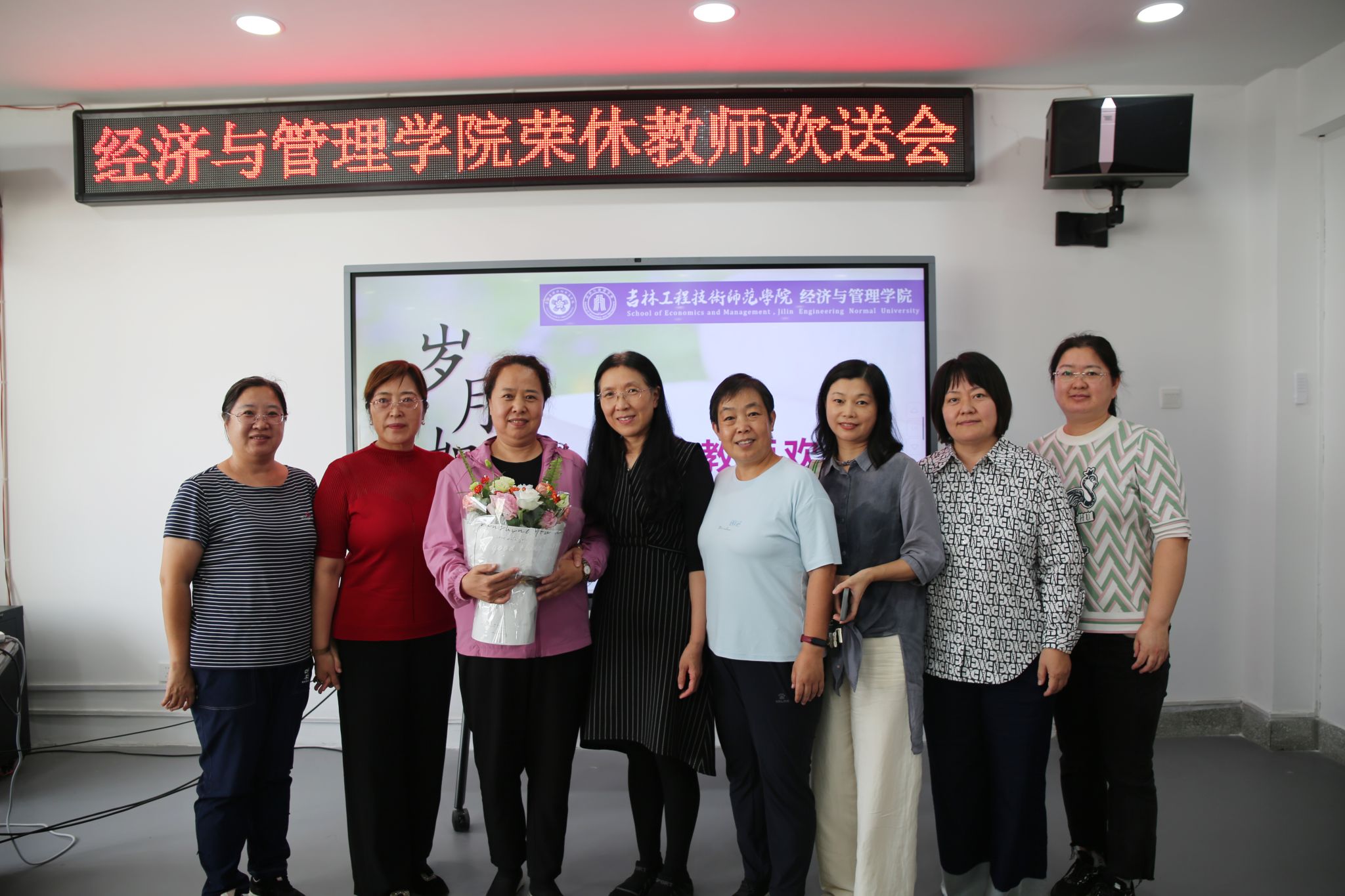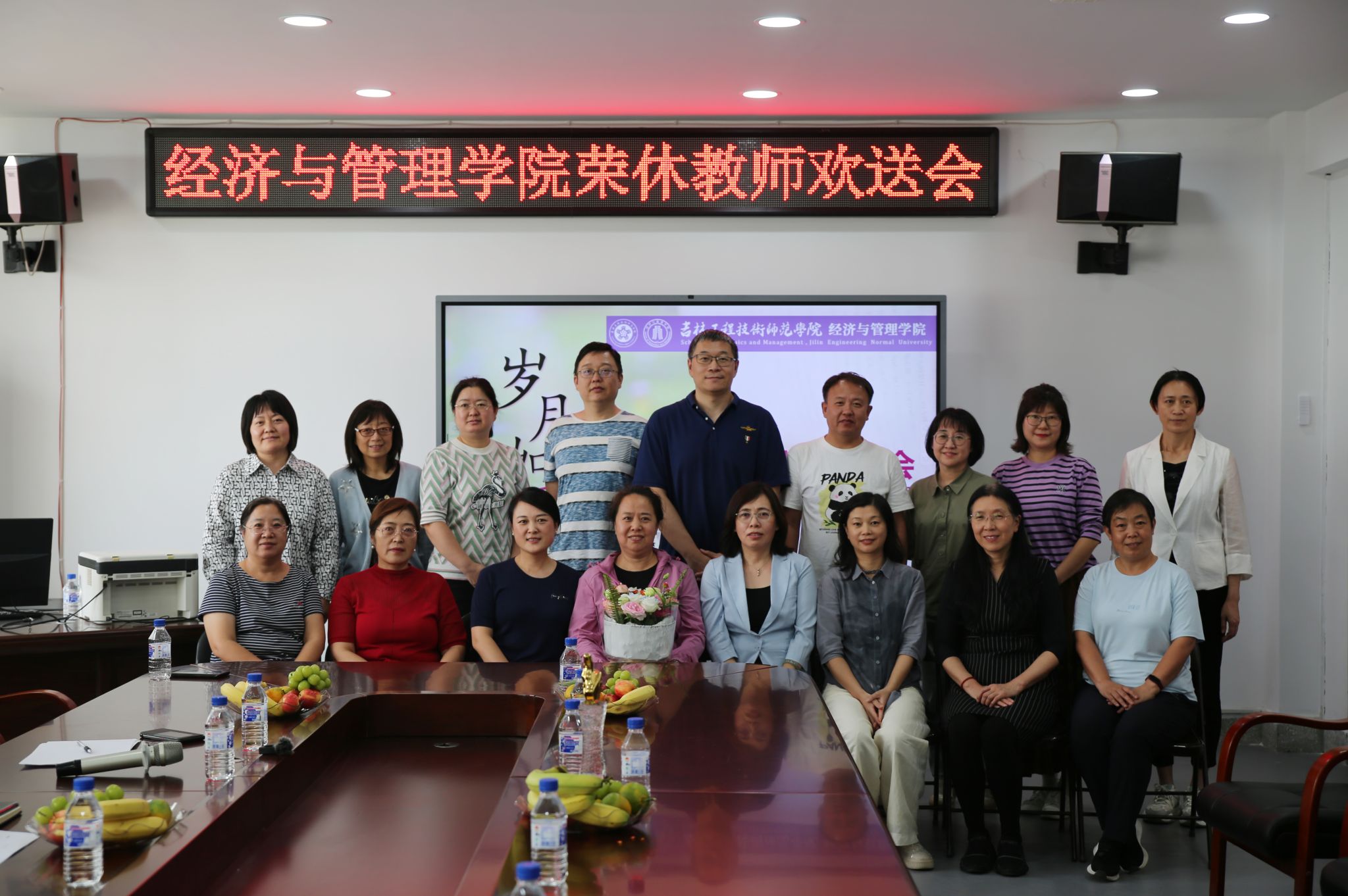 欢送会上全体教师合影留念,把对梁亚宁老师的不舍与祝福都定格在大家甜蜜的笑容中!