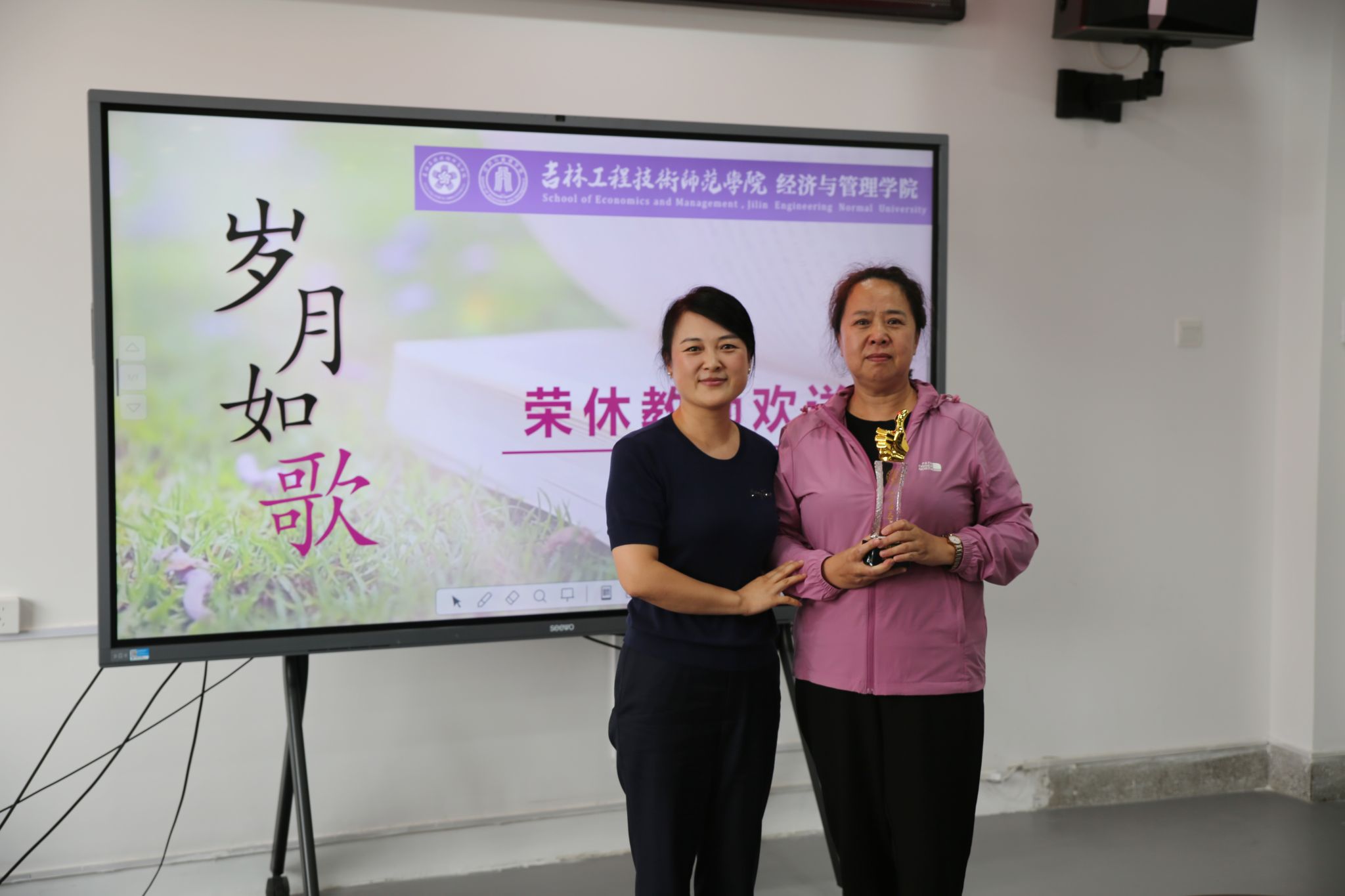 学院党委书记邱敏为梁亚宁老师敬献退休奖杯,并为梁老师送出最真挚的祝福。