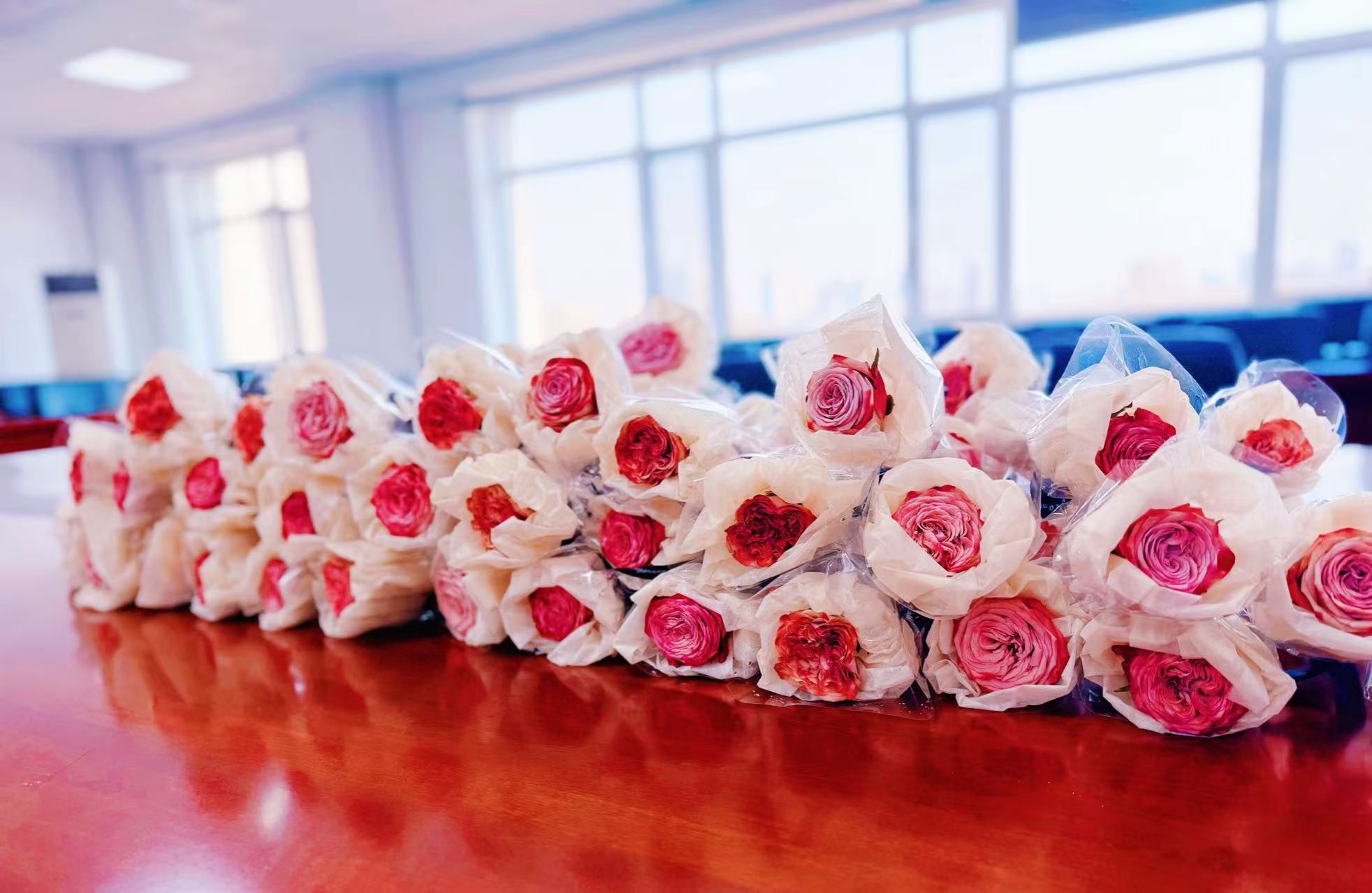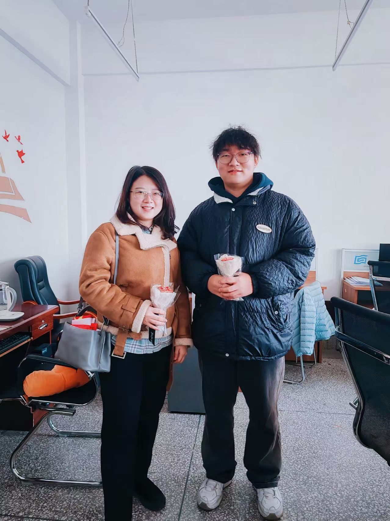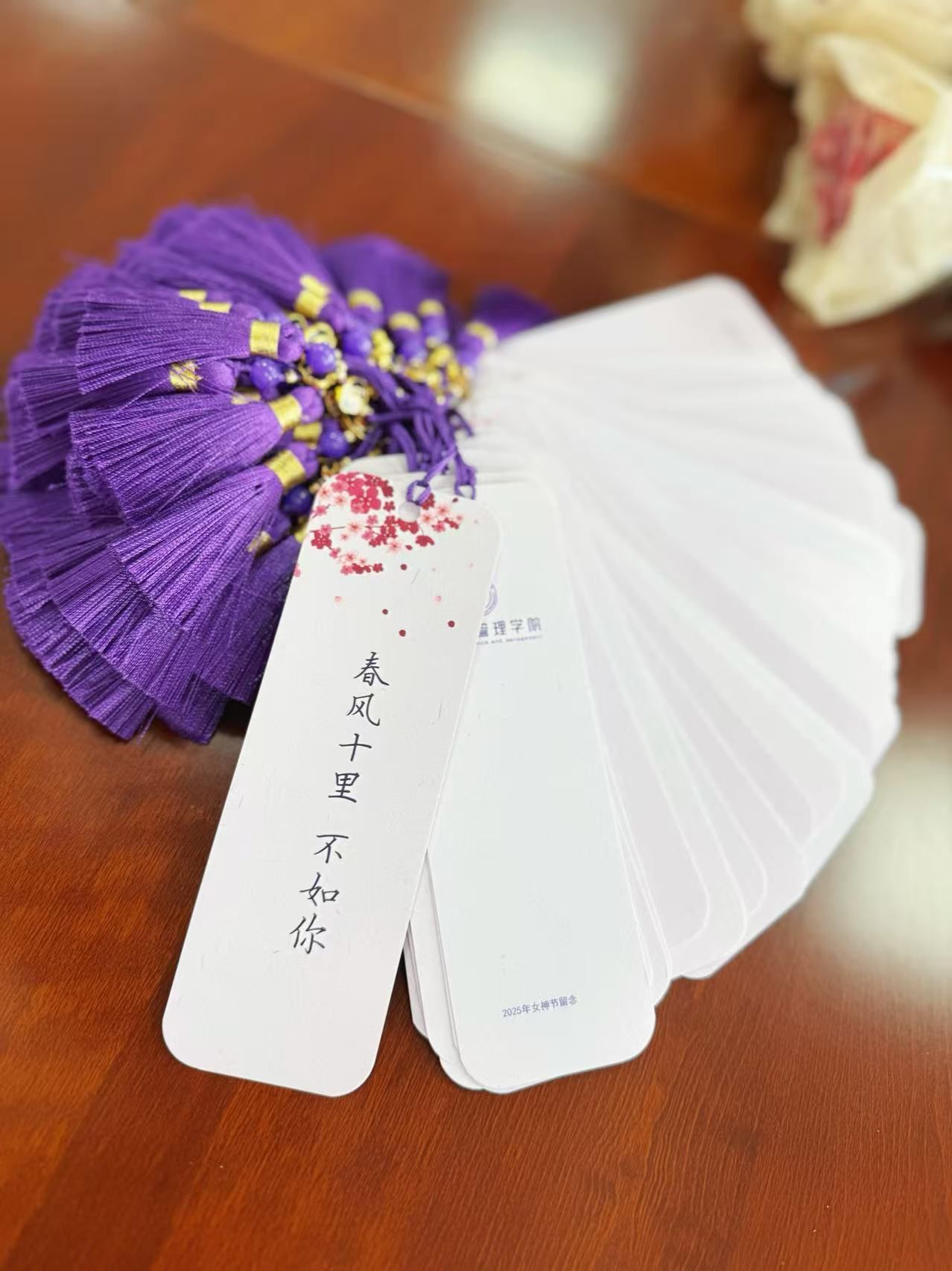 活动现场,满是精心包装的献花,桌上摆放着写有“春风十里不如你”的定制书签,学院的各个角落都是温馨的节日氛围。老师们在步入学院时,惊喜地收到了鲜花和书签。她们的脸上洋溢着幸福的笑容,纷纷合影留念,记录下这一美好的瞬间。