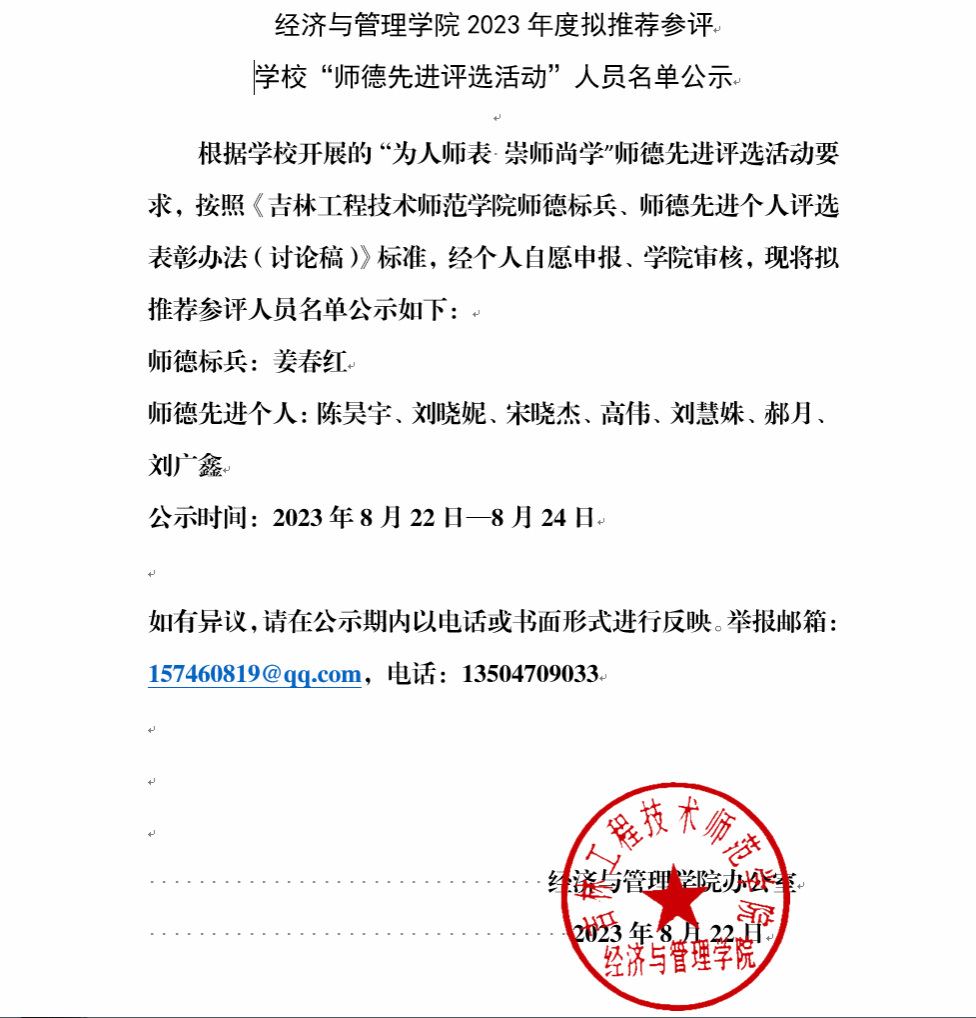 yl23455永利集团2023年度拟推荐参评 学校“师德先进评选活动”人员名单公示