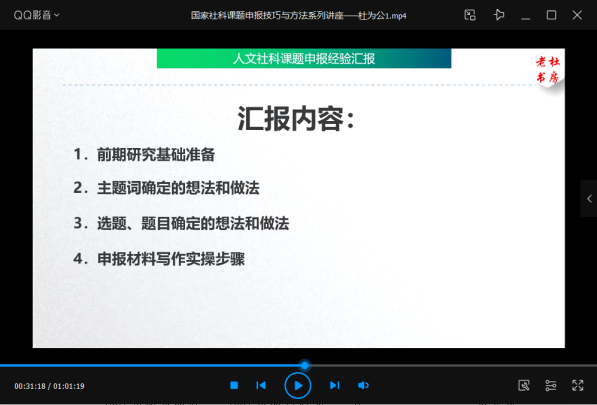 第四部分申报材料写作实操步骤,杜教授分享了自己总结的8条经验。第一,收集、整理、研读相关资料是开展申报材料写作的基础;第二,坚持“问题导向”,明确当前存在的、你准备解决的问题;第三,根据总目标,写出研究思路;第四根据研究思路,确定研究框架、内容、重点难点;第五,根据研究框架,确定“学术史梳理与动态研究”的对应内容;第六,完成其它的内容;第七,检查申报材料(活页)(申请书)内容相互之间的统一性;第八,修改格式、检查错字、提交。