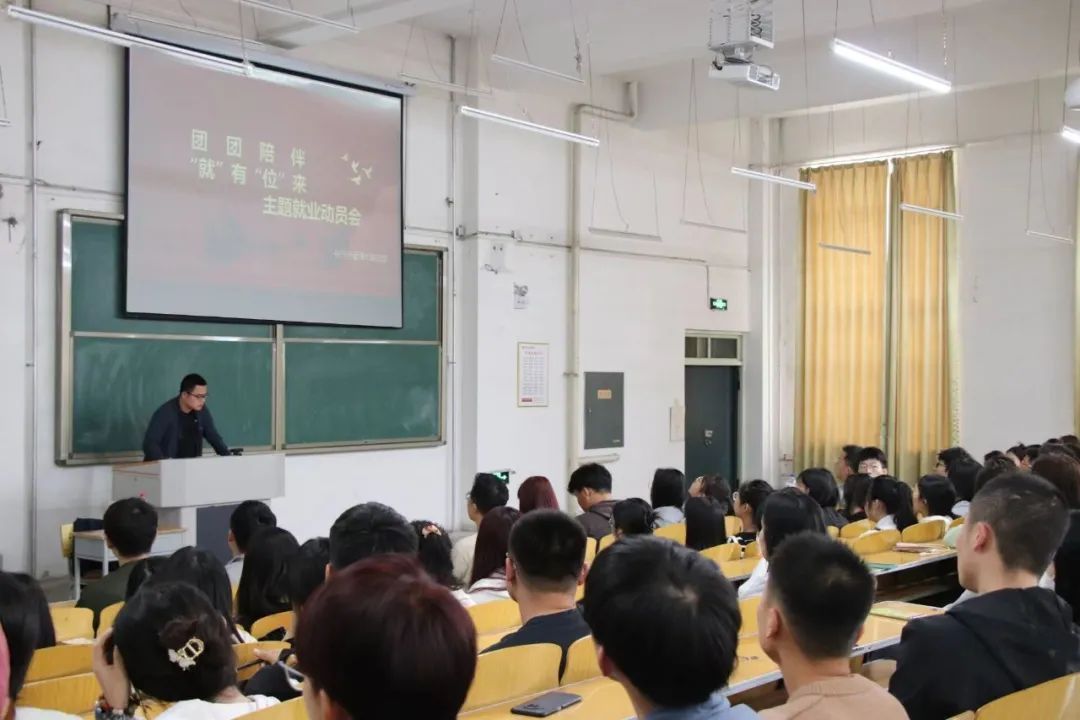 会上,学院团委书记王一名从国家就业战略、经济发展情况、社会就业形势等方面向同学们介绍了毕业生目前面临的就业形势。