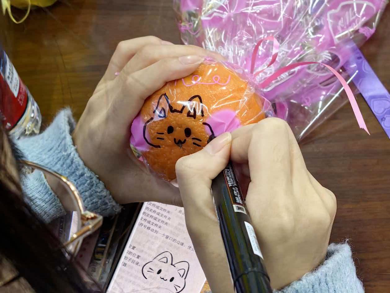 同学们用缤纷彩纸精心包裹鲜橙,手绘图案与祝福,将心意与期盼融入一笔一画,为考研的学长、学姐们送上色彩斑斓的暖心鼓励。